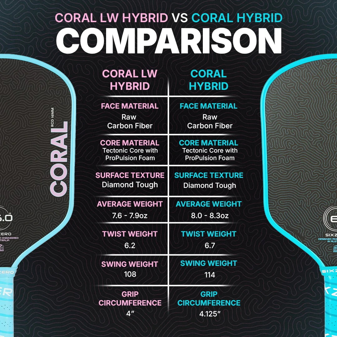 The Coral from Six Zero delivers a perfect blend of control, stability, and plush power, redefining a new era for all-court paddles. The Lightweight version maintains that trusted performance while offering a faster feel through the air and a thinner handle preferred by many players for grip comfort and customization.