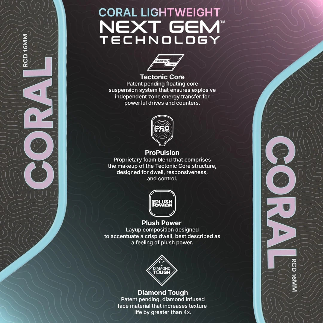 Built on the same award-winning Next Gem™ technology platform as the Coral, the Coral Lightweight delivers the balanced all-court performance players love with a quicker, more responsive feel. With a lighter base weight of 7.6–7.9 oz, this version is designed to increase hand speed, improve maneuverability during fast exchanges, and give players more freedom to customize their paddle setup.